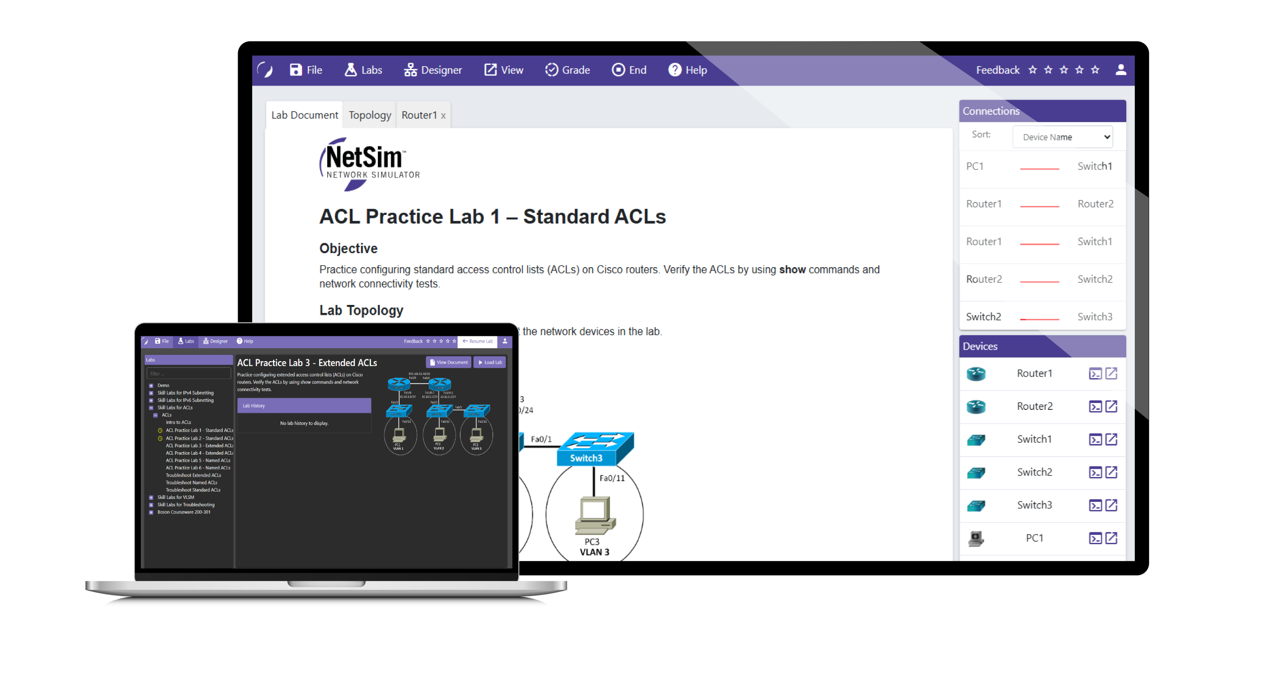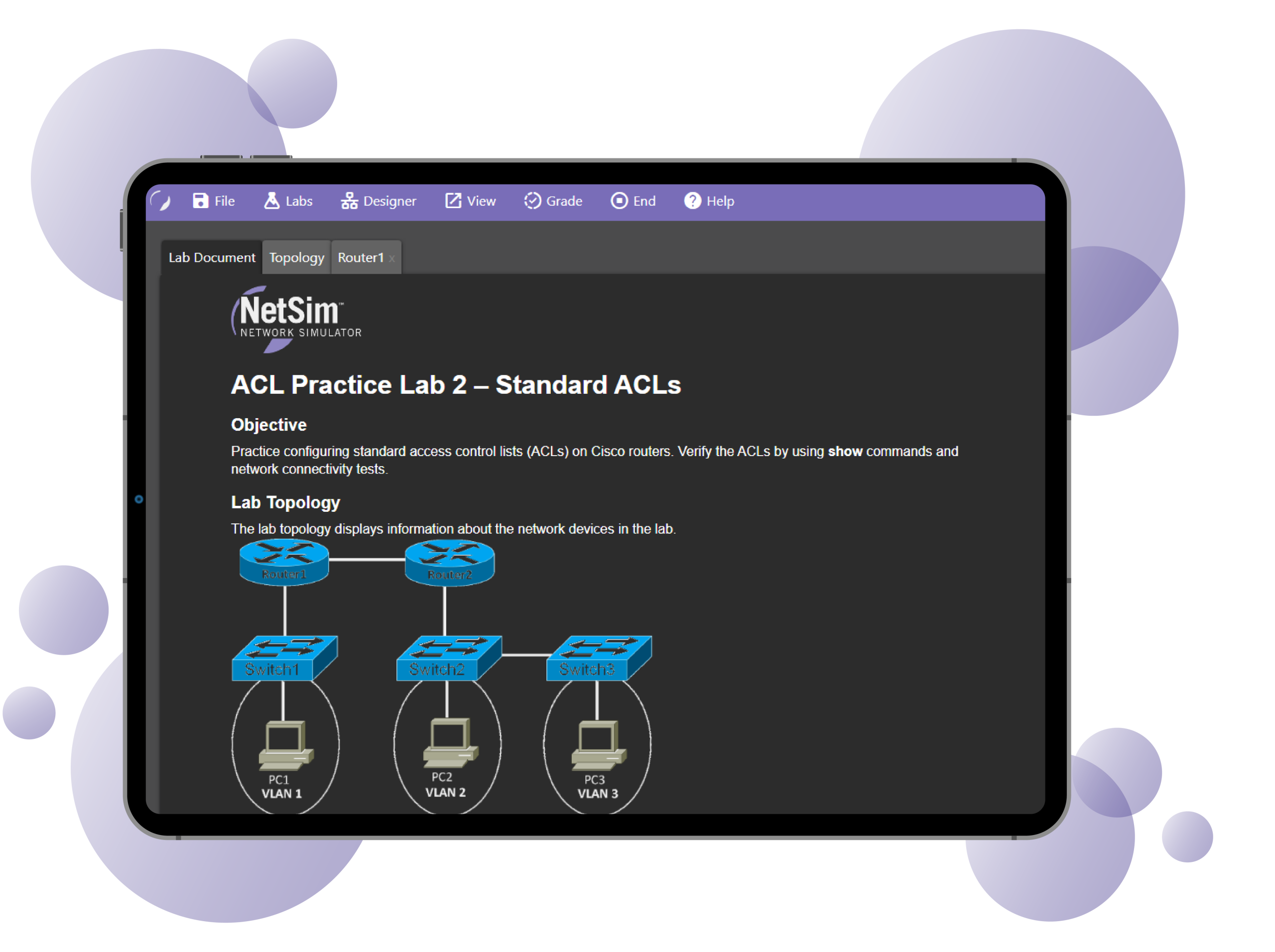 This NetSim Lab Pack includes 10 targeted labs that guide you through configuring standard and extended ACLs, rule placement, traffic filtering, and common troubleshooting scenarios. You’ll practice configuring ACL statements, applying them to interfaces, and verifying traffic behavior – skills that are critical for securing networks and managing data flow in enterprise environments.