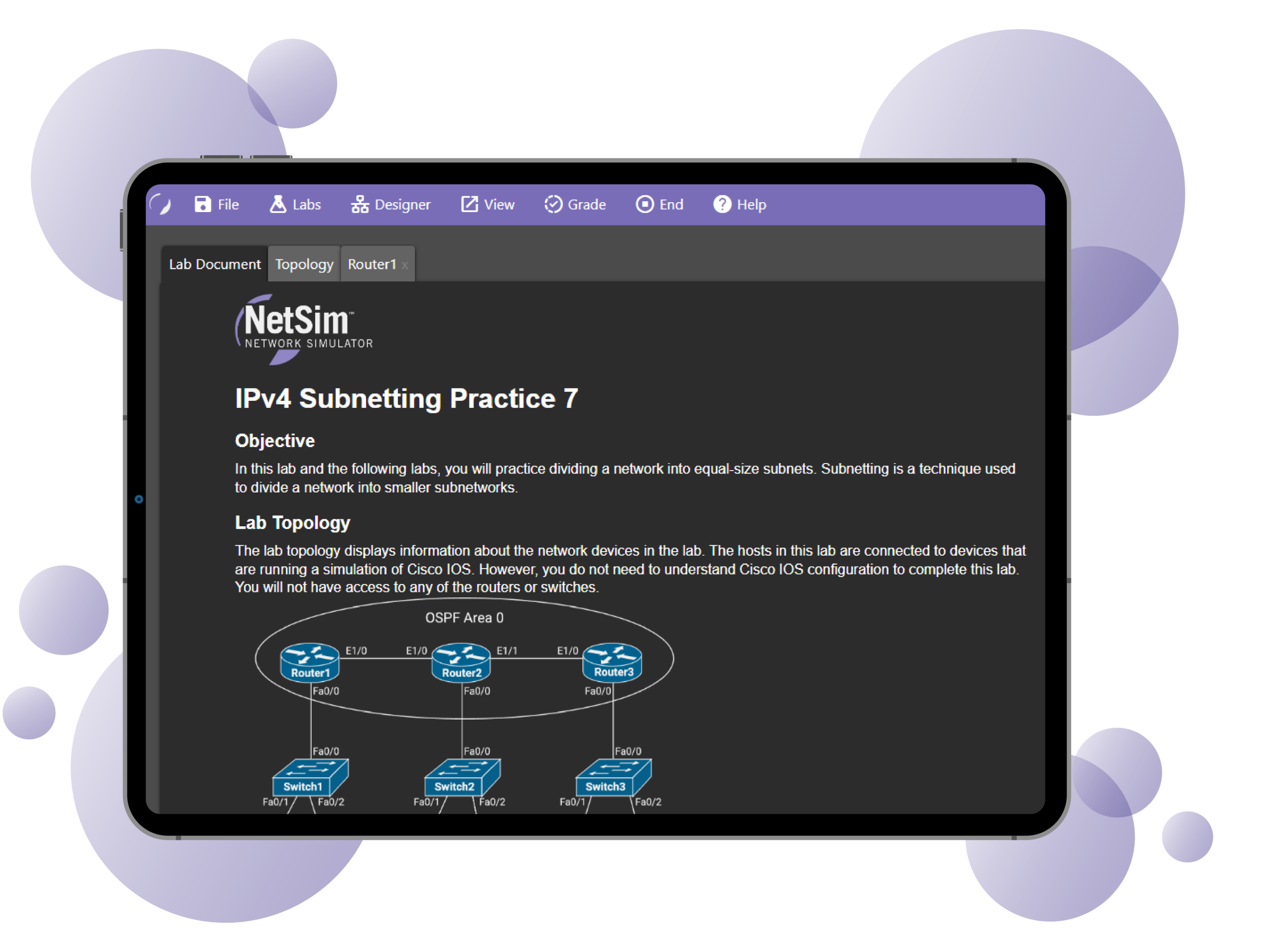 This NetSim Lab Pack includes 10 targeted labs that walk you through real-world IPv4 subnetting scenarios from foundational concepts to more advanced subnet design. You’ll practice calculating subnets, determining usable host ranges, identifying network and broadcast addresses, and applying subnetting logic in realistic network environments.